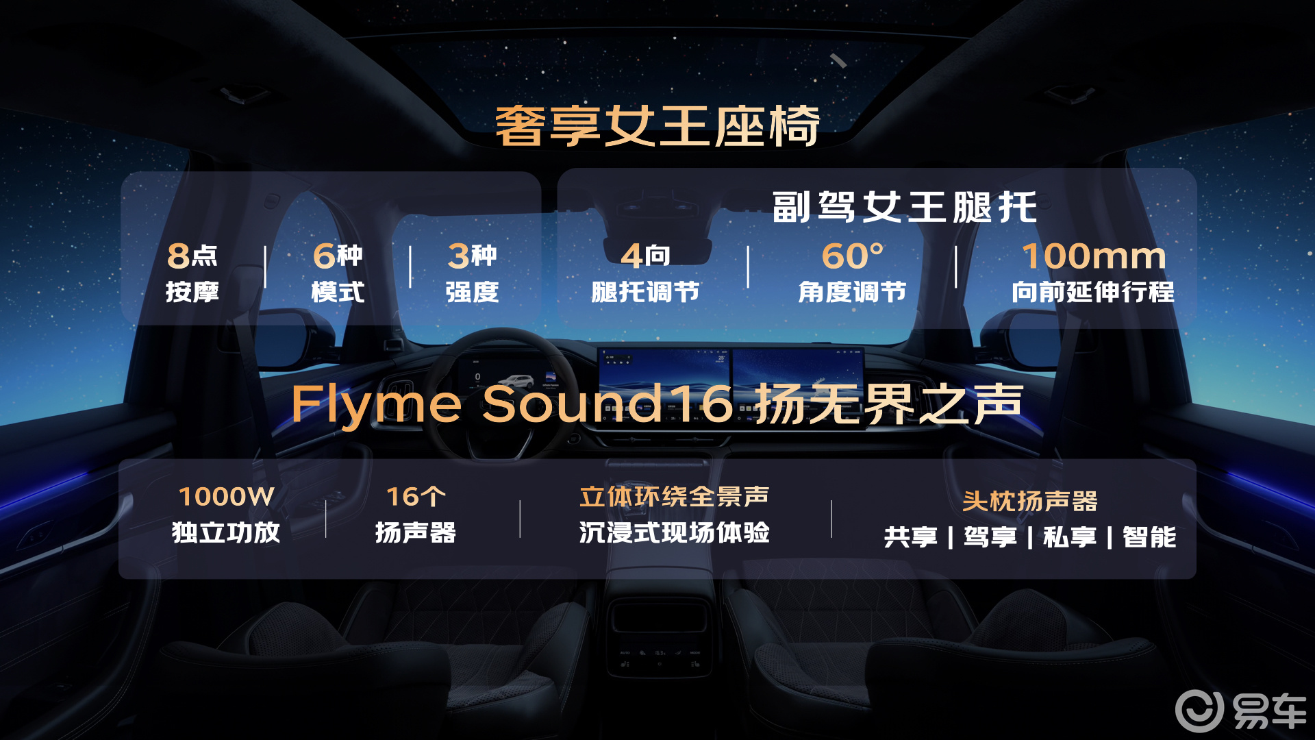 舒适性配置方面,新车副驾座椅支持8点按摩和100mm腿托调节,后排靠背支持30°-40°电动调节。其音响系统采用16扬声器布局,包含主驾头枕私密声场;车内还配备50W无线快充和车载香氛系统。