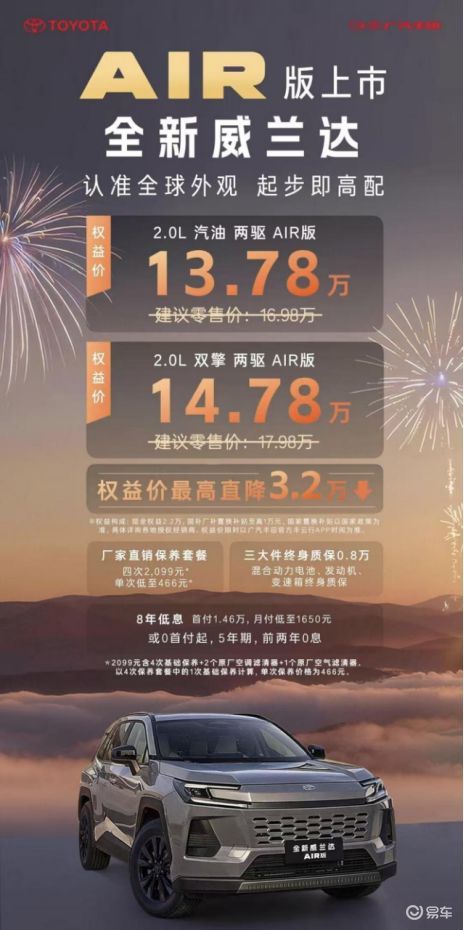 2月24日,广汽丰田全新威兰达AIR版上市,权益价13.78万起,比指导价低了3.2万。入门版标配L2辅助驾驶和14英寸中控屏,配置也是相当实在。