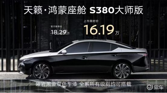 天籁·鸿蒙座舱S380大师版,限时价16.19万。用的是华为鸿蒙座舱,还配了15.6英寸的屏幕和2.0T VC-Turbo发动机。在燃油车上直接嫁接华为生态,说明东风日产在智能化这条路上,选择了一条更务实的路径。