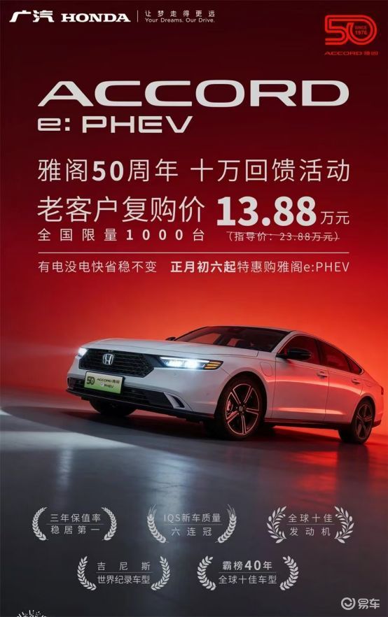 2月22日,广汽本田雅阁e:PHEV直降10万,老客户复购只要13.88万,限量1000台。这是一次精准的客户回馈活动,让更多消费者有机会体验广本的插混技术。